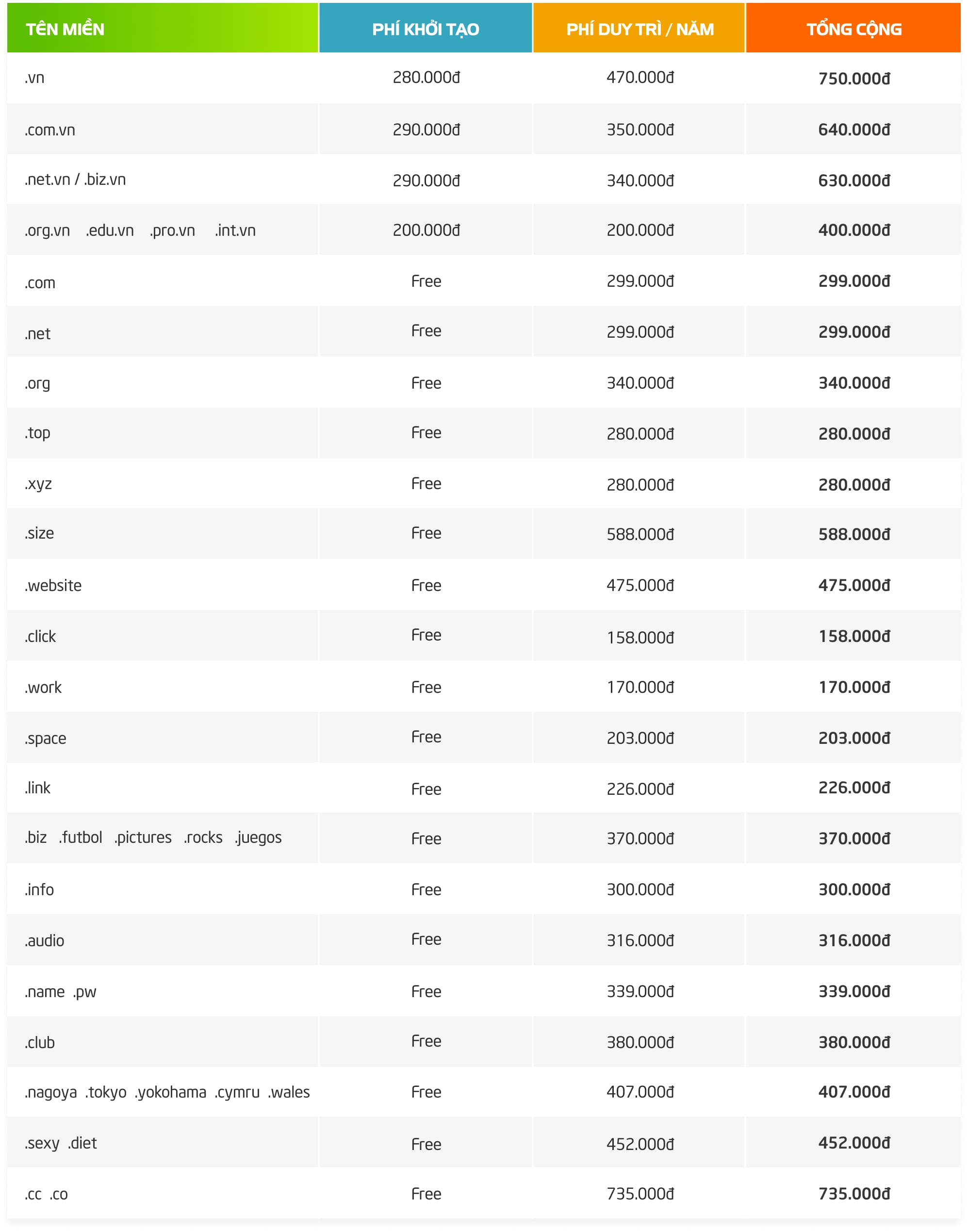 Bạn muốn mua tên miền website chất lượng? Nhưng không viết mua domain giá rẻ uy tín, chất lượng ở đâu? Vậy bạn nhất định không nên bỏ qua dịch vụ đăng ký tên miền của THIẾT KẾ WEB 300K. Bạn có thể tham khảo bảng giá tên miền giá tốt, chất lượng ở bên dưới!